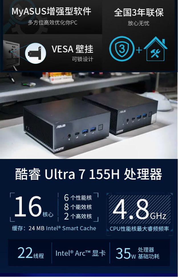 华硕PN65与NUC 13 Pro:如何做出选择?在追求高效能与便携性的今天,迷你主机成为了越来越多用户的选择。华硕PN65与英特尔NUC 13 Pro作为市场上两款备受瞩目的产品,各自拥有独特的优势和特点。本文将从处理器性能、扩展性、接口丰富度以及应用场景等方面对这两款产品进行对比分析,帮助读者做出更明智的选择。处理器性能华硕PN65:PN65提供了两款处理器选择,Intel Core Ultra 5 125H 和Ultra 7 155H处理器,这款处理器在核心数上表现出色,拥有更多的核心和线程,适合处理多线程任务,如渲染、图形处理和AI工作负载。其Arc核显在最大主频上虽然略低,但预算单元更多,且具备AVC编码功能,使得在特定应用场景下表现更为出色。此外,PN65支持双通道DDR5内存和双PCIe Gen4 x 4,为用户提供了良好的性能释放平台。