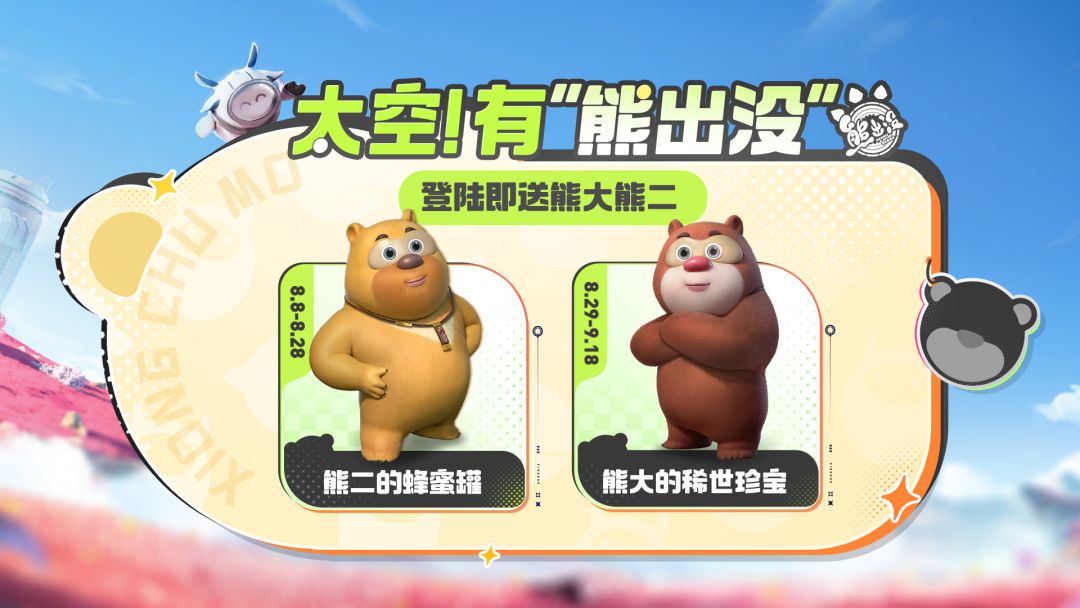 参与版本活动「太空!有“熊出没”」,不仅登录即送熊大、熊二,还有11张熊出没召唤券及家具熊二唱片机、时空穿梭椅免费拿!