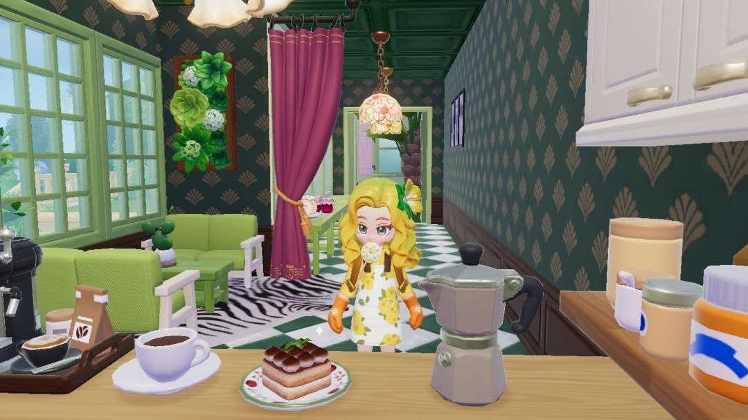 采用了大量的绿植做装饰,颜色上也是采用我喜欢的浅绿色做主要色系。有宠物房、咖啡屋、小桥、凉亭、悬浮灯(跟小红薯@阿哩不是狸大大学习的,超级棒瞬间氛围感拉满),感觉我能在里面呆一整天