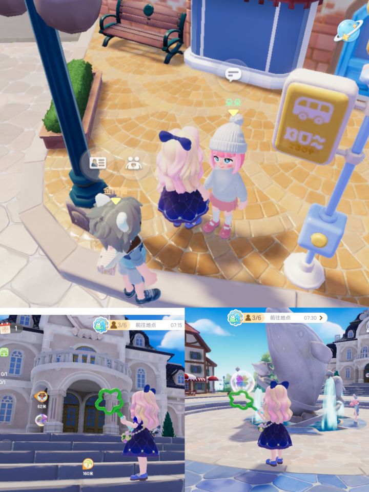 朵朵在城中心服装店对面的公交站,彩虹花束在鲸鱼喷泉安妮经常待的位置,和镇长躲雨的地方,第三个在自己家园回家就能看见