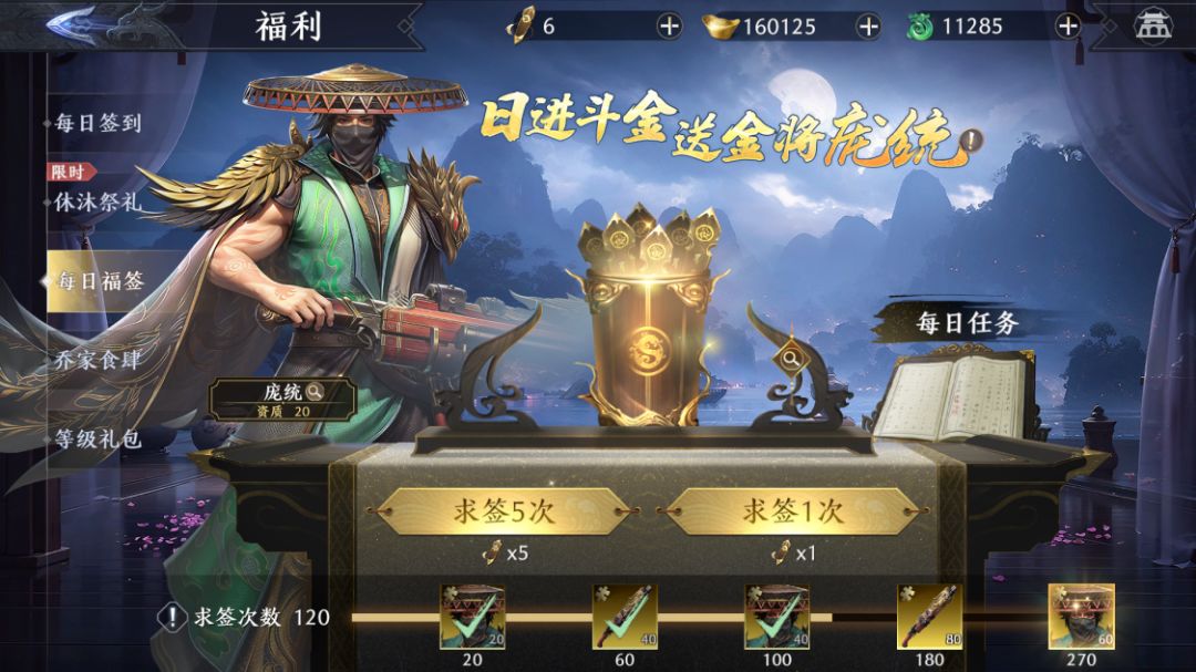 庞统可以通过完成福利页面内的每日福签任务获取武将碎片以及神兵碎片。