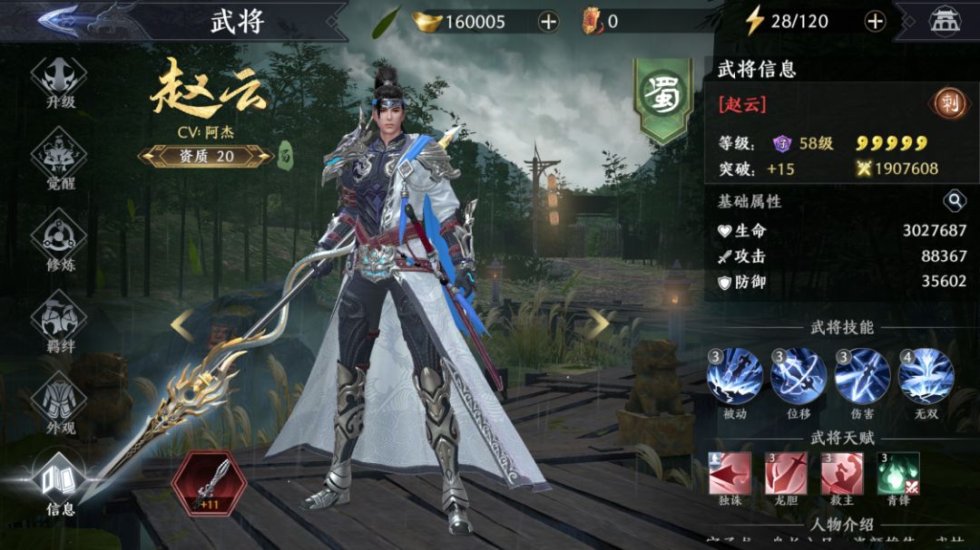 首先必养的武将就是赵云,游戏内武将分为14、16、18、20和22资质,赵云作为一个18武将资质的武将,是可以通过常驻招募卡池内获取的,并且游戏内的招募贴资源十分充足,完全不用担心抽不到的问题。除此之外,赵云还可以通过游戏内的店铺内的国战店铺、公平店铺和星魂店铺换取武将碎片,演武店铺换取神兵碎片,将星店铺换取神兵铸图,让你的赵云+15不是梦。