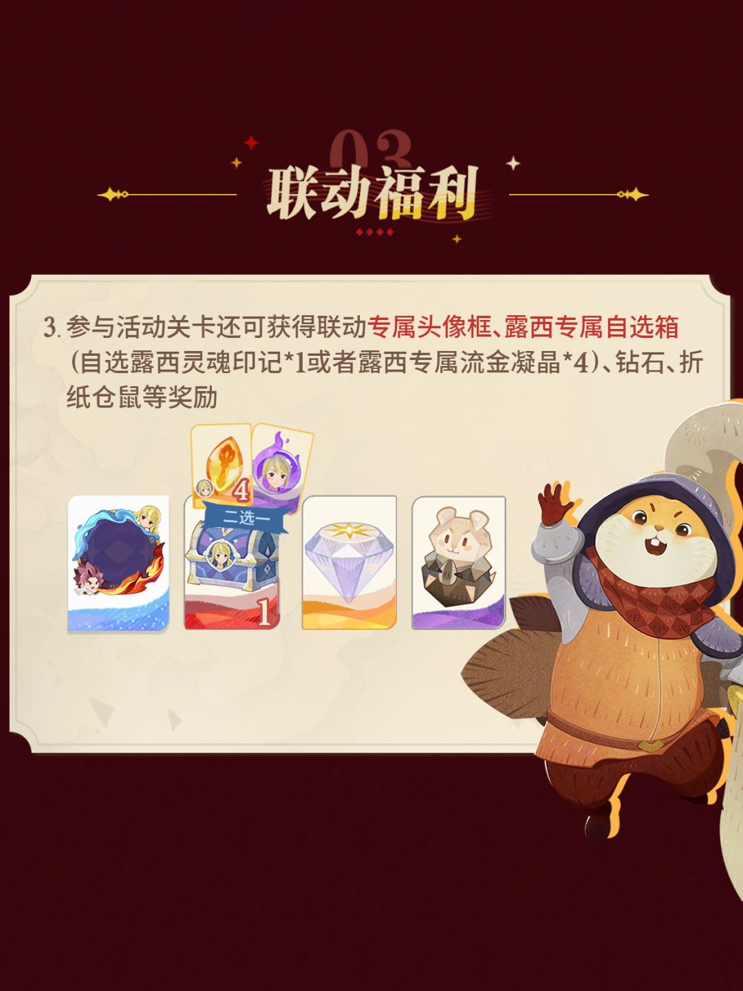 《剑与远征:启程》X《妖精的尾巴》联动将于5月1日开启,参与活动得人气角色露西培养资源,更有30抽专属虚空金叶免费送~