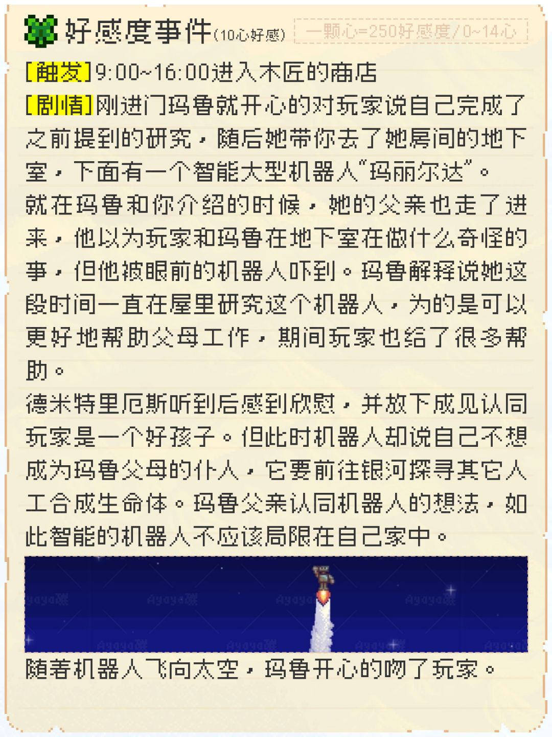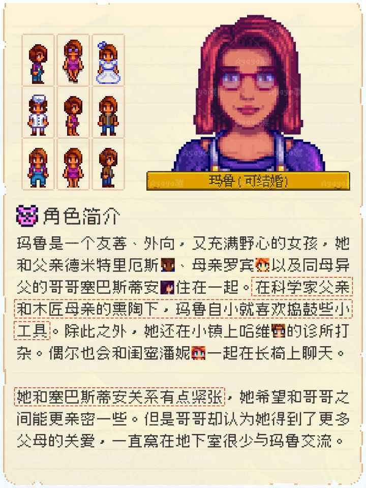 玛鲁是《星露谷物语》游戏中玩家可结婚的12个角色之一,她热爱研究,性格开朗,对星空着迷,与同母异父的哥哥赛巴斯有些相处不来……