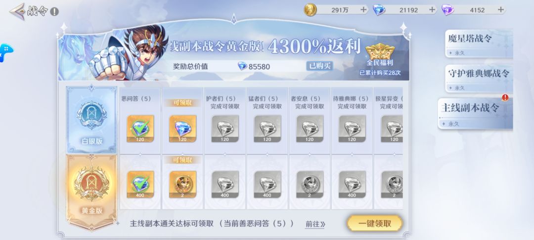 第三个卡池就是心愿卡池,可以指定2个黄金斗士出(不包含限定)输出选一个(建议选大艾,主线战令会送大艾本体,很容易满星)