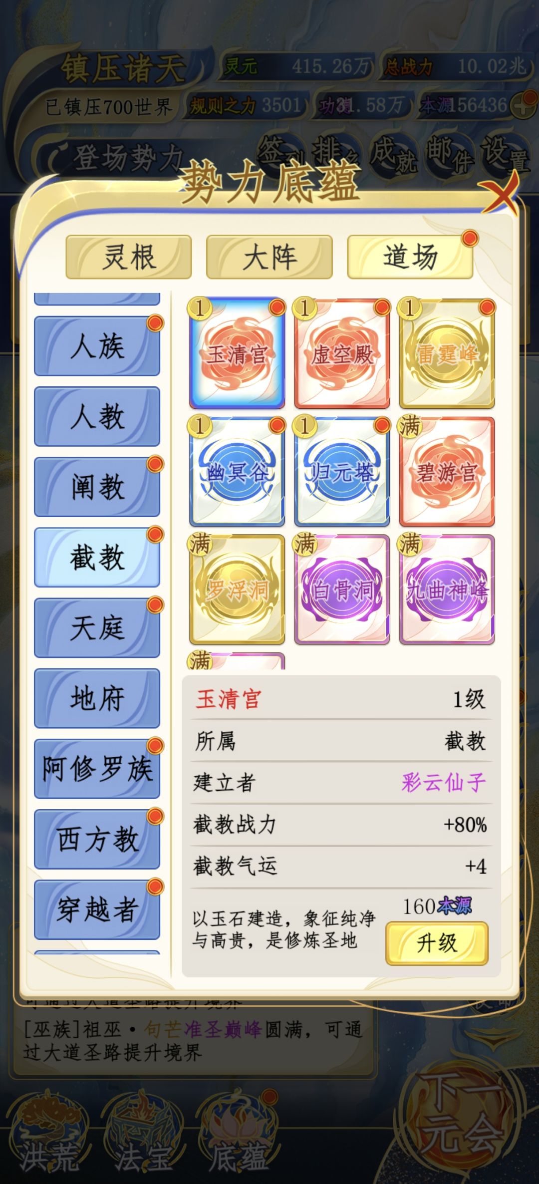 个人的巫族比妖族在人口上更具优势,也达到了10个道场,但质量一般。人族人口也多,但数量不如巫族,质量有胜。截教运气不错,数量质量双赢阐教了。