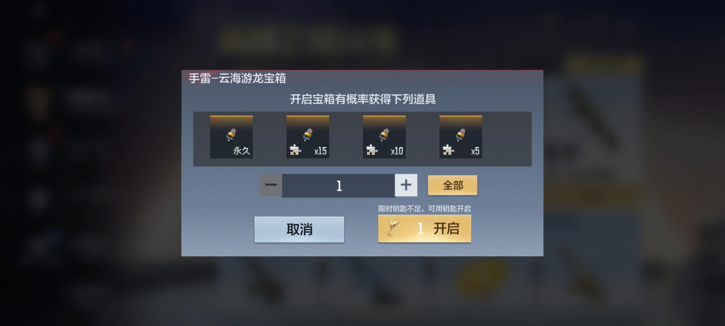 要获得手雷-云海游龙,小伙伴们必须通过英雄之钥兑换宝箱,开启宝箱后有机会获得碎片或永久版本。每个宝箱包含四个核心道具,分别是手雷-云海游龙碎片5、10、*15,以及概率直接获得永久。