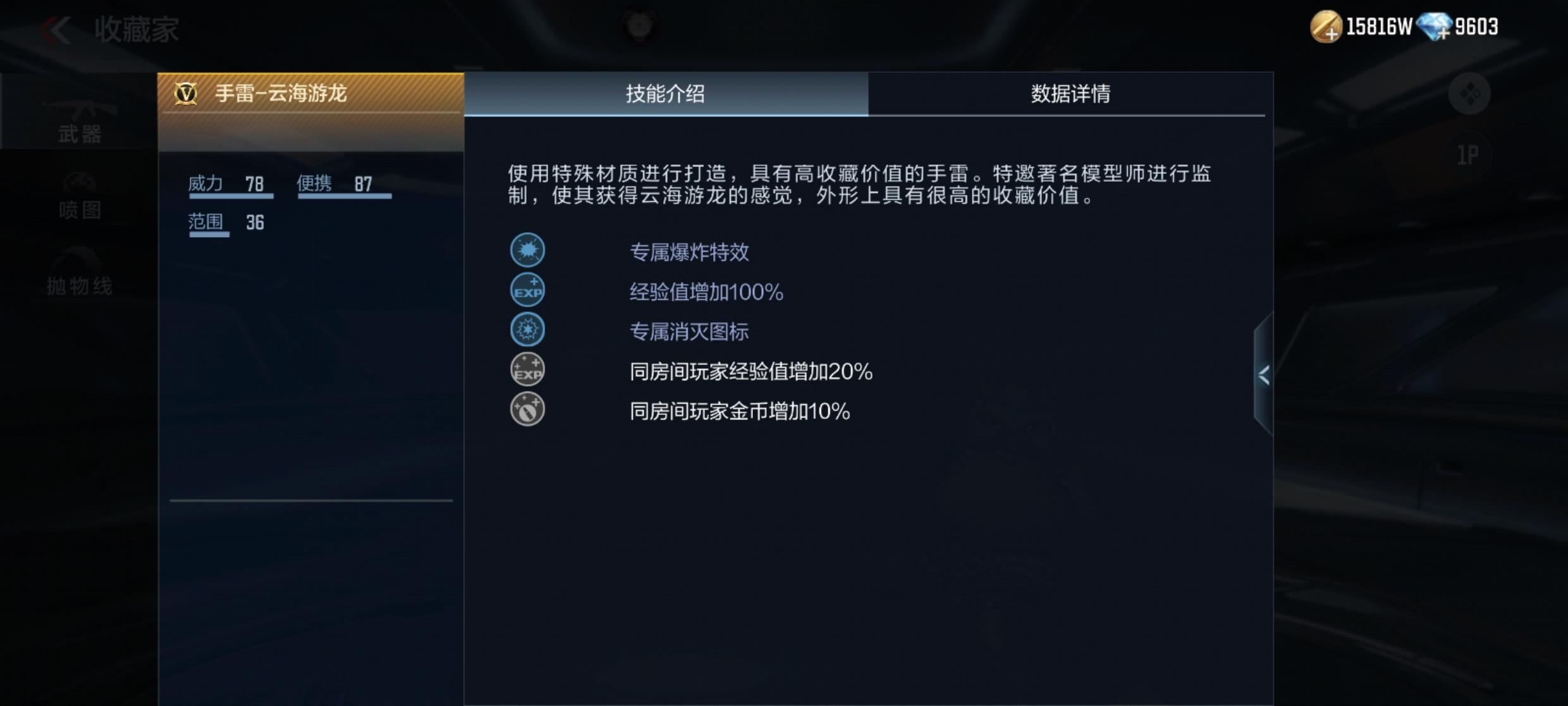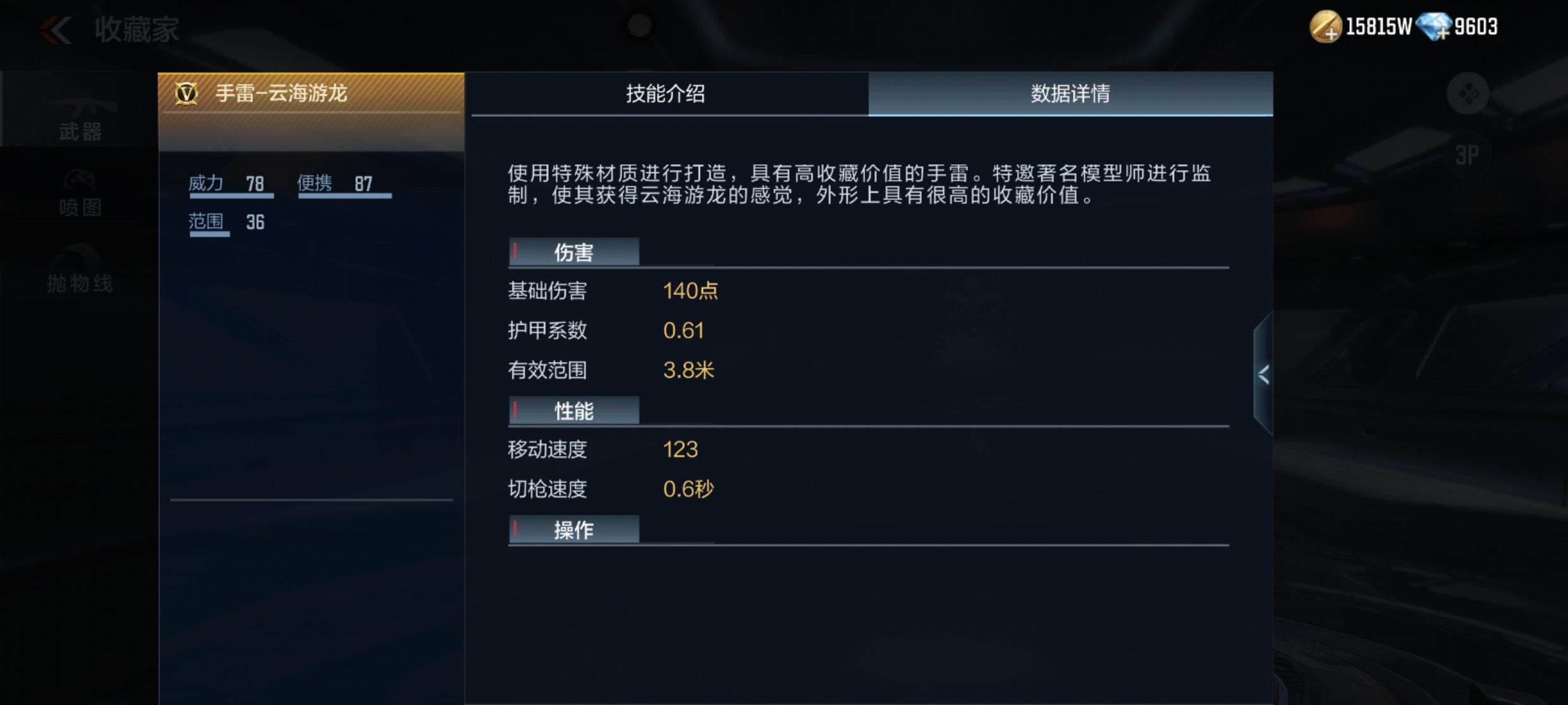 手雷-云海游龙在数据方面表现出色,基础伤害高达140点,护甲系数也比一般手雷高出0.01,达到0.61。虽然它的范围中规中矩,为3.8米,但移速和切换速度非常出色,分别为123和0.6秒。这些数据都表明手雷-云海游龙的出色。