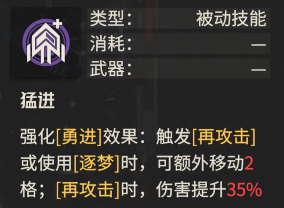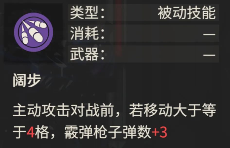 那么这个专武最为主要的两个增伤作用就是【阔步】提供的移动≥4格时的子弹+3,另外还有对于马库斯天赋的增益,当然这个增益里面的“再攻击”伤害提升只会针对马库斯生效,其他角色是无法享受到这个增伤效果的。