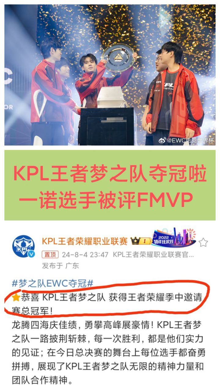 8/4号深夜,KPL王者荣耀官博发文,庆祝KPL王者梦之队 获得王者荣耀季中邀请赛总冠军❗❗❗