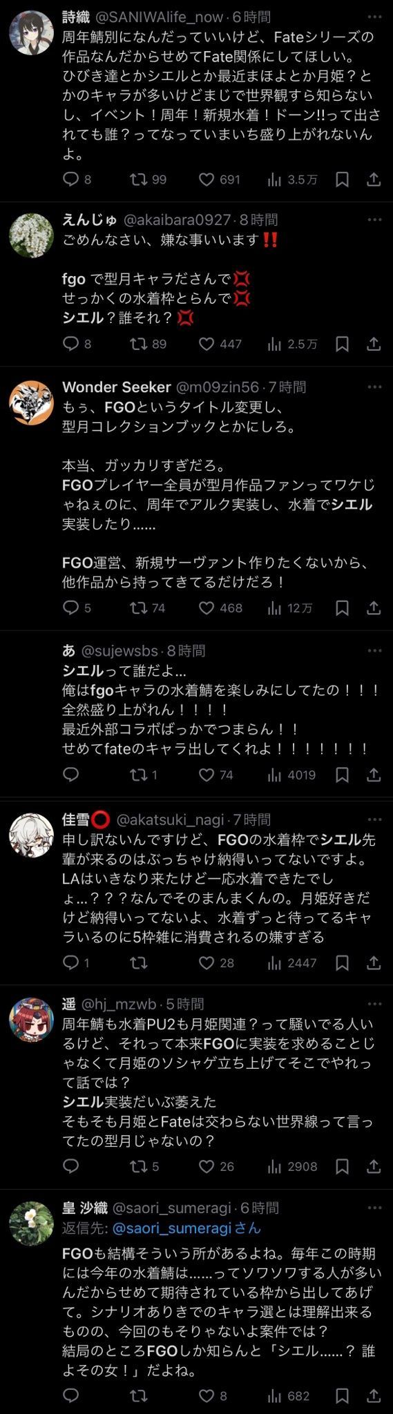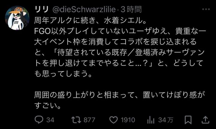 2角色联动问题:部分玩家对F/GO以外的型月世界观角色并不感兴趣,他们认为联动角色应该以联动活动的形式加入,而不是通过泳装活动这种"非正常"途径。今年上半年已经进行了两次联动,加上新年和七月活动的角色,角色联动的频率远超往年,希耶尔的加入进一步加剧了玩家的不满情绪。