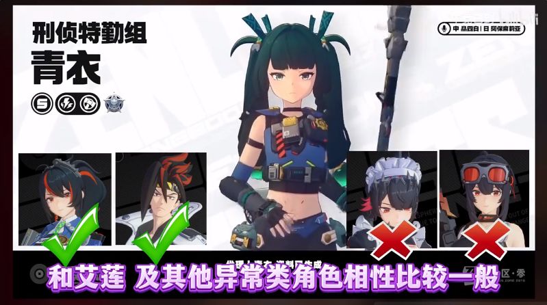 总的来说,绝区零开服 1.1 这两位 S 级代理人中,青衣作为站场击破,比较适配朱鸢和安东这样的爆发速切主C,和艾莲及其他异常类角色相配比较一般,但考虑到她对开服玩家而言,基本算是除 300 抽自选外,唯一能稳定获得的 S 级击破,在前期开荒以及高压 boss 战上有着巨大的失衡效率优势,对于那些还没有 S 级击破的玩家,可以说非常值得入手,并且越早拥有,对你的游戏体验提升就越大。