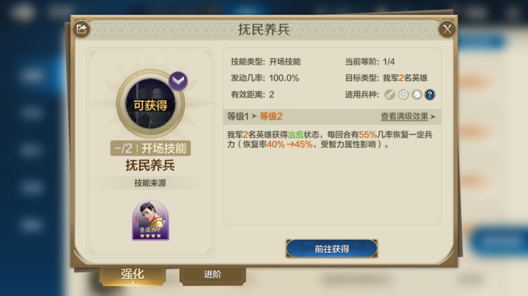 抚民养兵差不多是青春版的整军经武,能为关羽提供55%的增伤,也就是提供一次增益。并且是开场技能,每回合都能提供,效果不错。