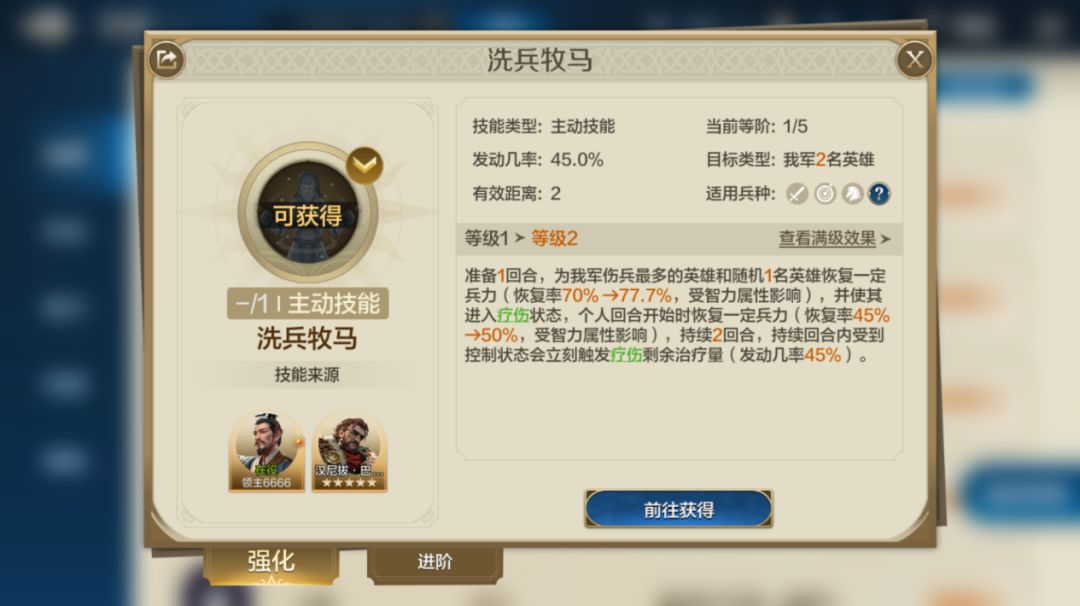 随后是洗兵牧马,这个获取难度不高,故也列进来。和振奋军心一样,同样是疗伤效果,只不过时间更久一些。