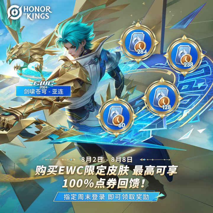 在8.2-8.8期间购买皮肤并在特定周末登录,可以获得高达100%的限时点券返利!