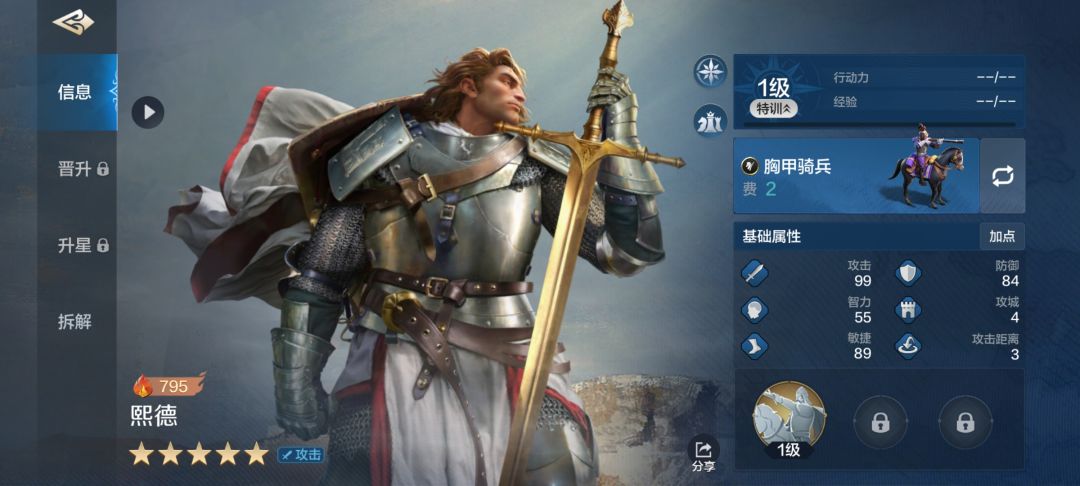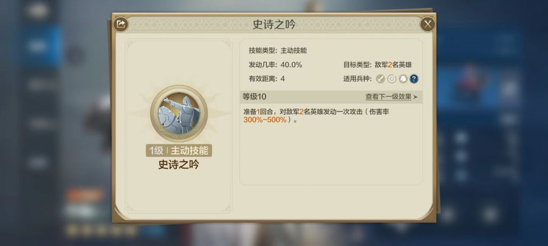 专属技能【史诗之吟】:准备1回合,对敌军2名英雄发动一次攻击(伤害率300%~500%)。