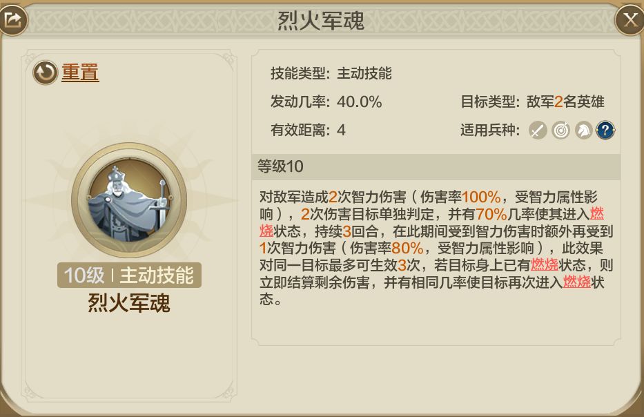 专属技能【烈火军魂】:对敌军造成2次智力伤害(伤害率100%,受智力属性影响),2次伤害目标单独判定,并有70%几率使其进入燃烧状态,持续3回合,在此期间受到智力伤害时额外再受到1次智力伤害(伤害率80%,受智力属性影响),此效果对同一目标最多可生效3次,若目标身上已有燃烧状态,则立即结算剩余伤害,并有相同几率使目标再次进入燃烧状态。