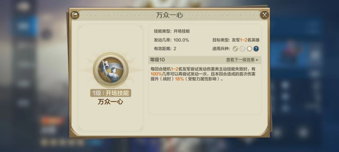 专属技能【万纵一心】:每回合随机1~2名友军尝试发动伤害类主动技能失败时有100%几率可以再尝试发动一次,且本回合造成的首次伤害提升(战时)18%(受智力属性影响)。