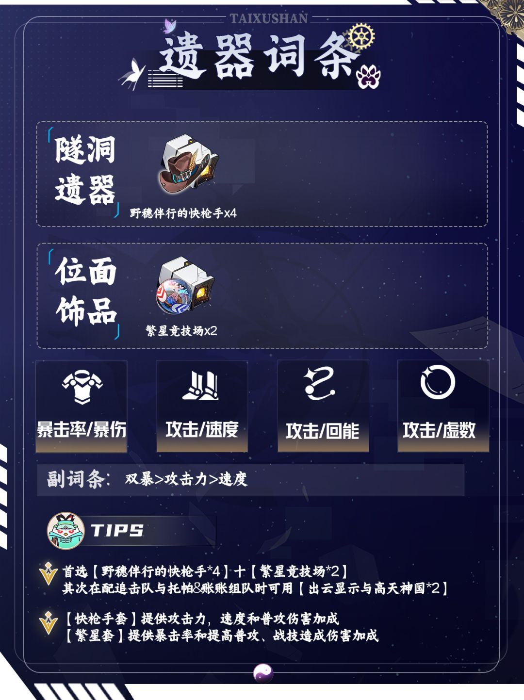 ①遗器方面:首选【野穗伴行的快枪手*4】十四【繁星竞技场*2】其次在配追击队与托帕&账账组队时可用【出云显示与高天神国*2】