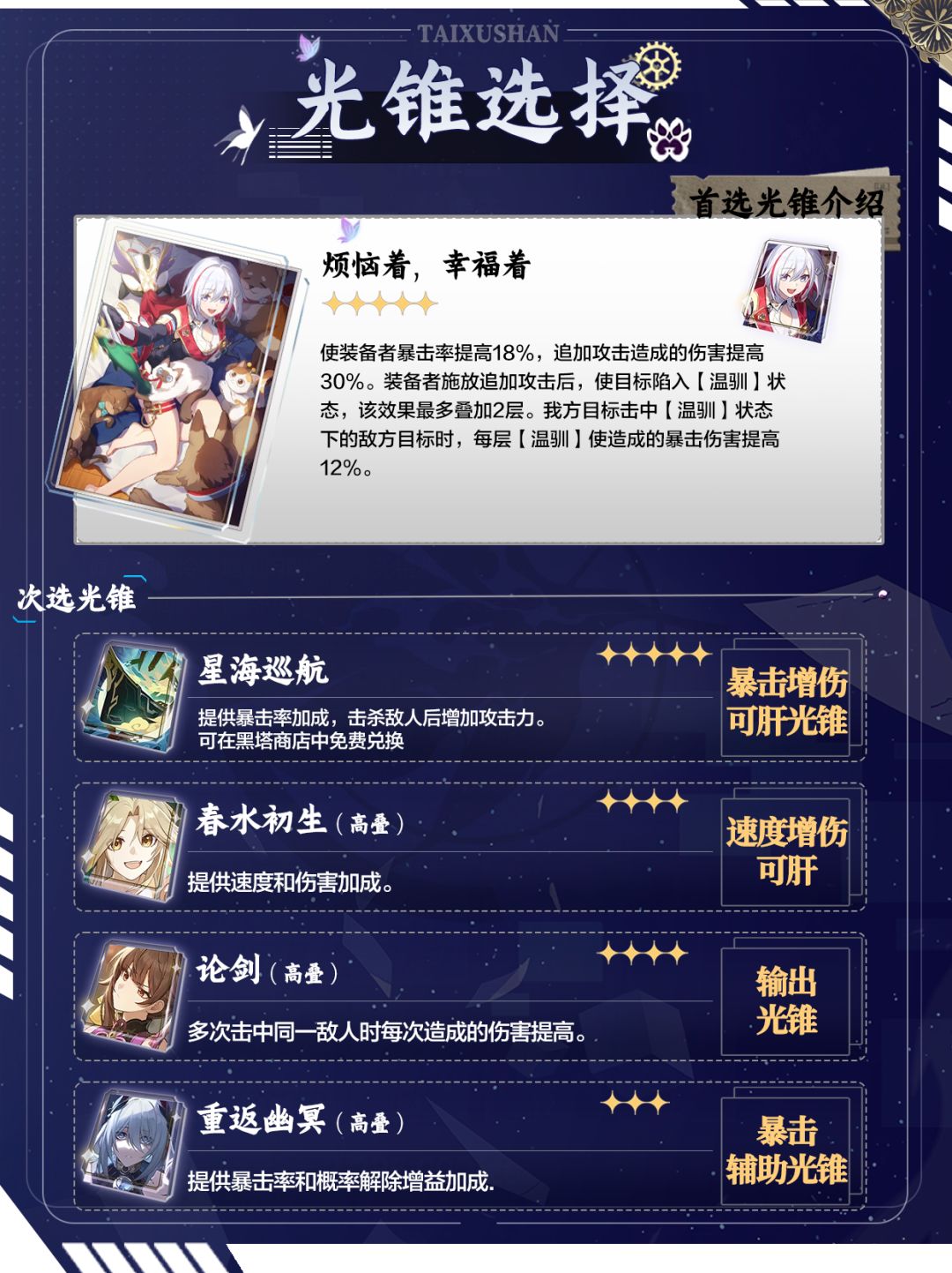 【烦恼着,幸福着】:提高暴击率和追加攻击伤害并附加[温驯]状态提高所受到的暴击伤害