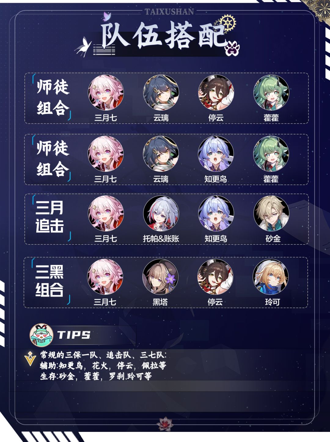 三七队:云璃、三月七(巡猎)停云、藿藿