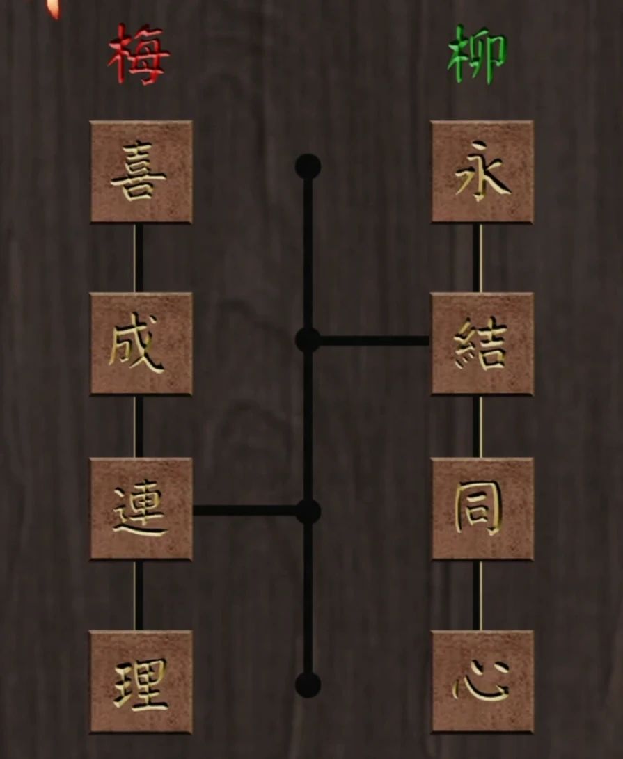 最后一章啦,首先注意一下门口对联,对联带数字或者颜色的大多数都是后面的线索,所以重点是绿永结同心,红喜成连理,查看一下左右的两张壁画,很简单的无联动旋转拼图,从中间往外转即可,左边是鸳鸯戏水图,右边是喜鹊连枝图,拼好后拿到两个圆环。