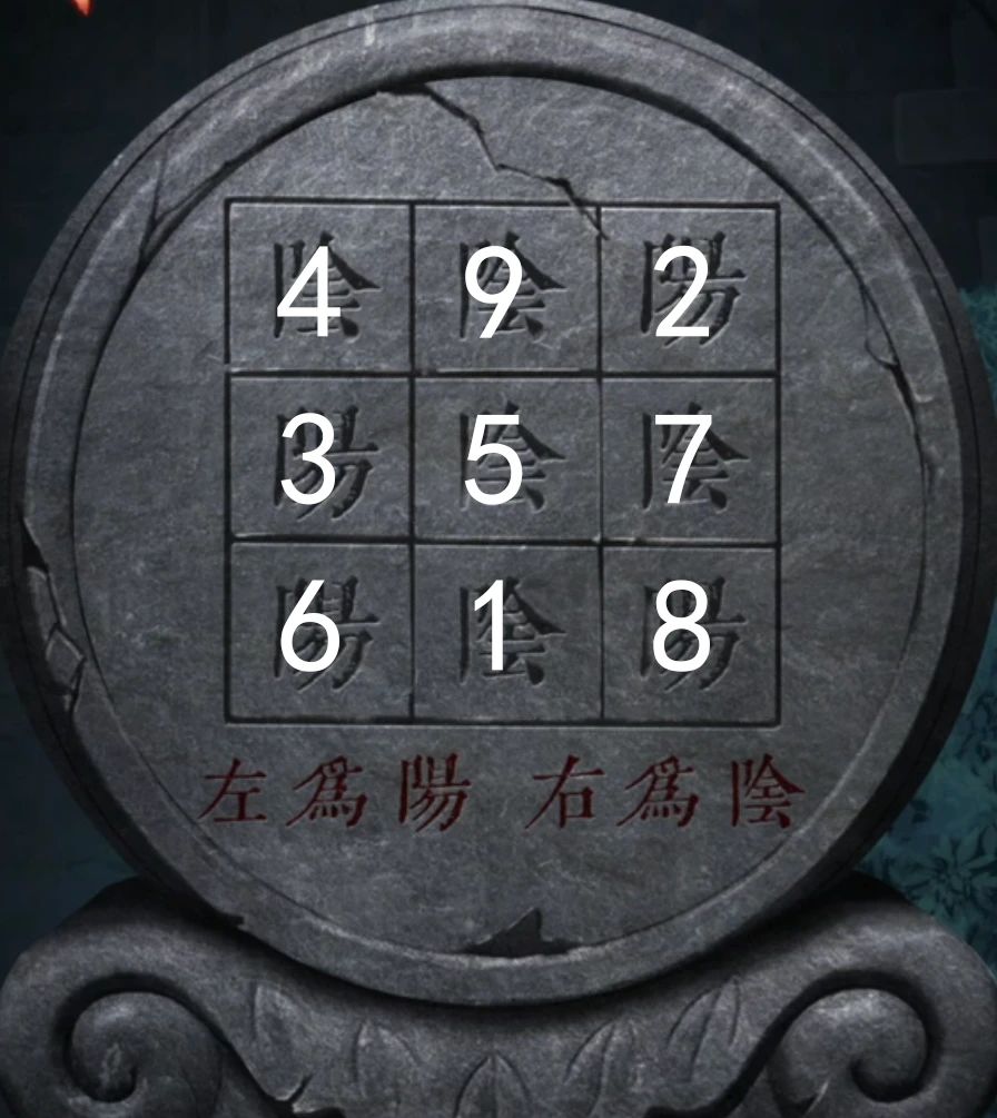 不过这里米雪就只写正确答案吧,答案如上图,既然是连续数字,那么按照数字顺序我们就获得了一串密码阴阳阳阴阴阳阴阳阴,还有个提示是左阳右阴,所以我们上面的密码就换成了右左左右右左右左右,将两个门环都放在门上后按照这个顺序敲门就可以开门了。