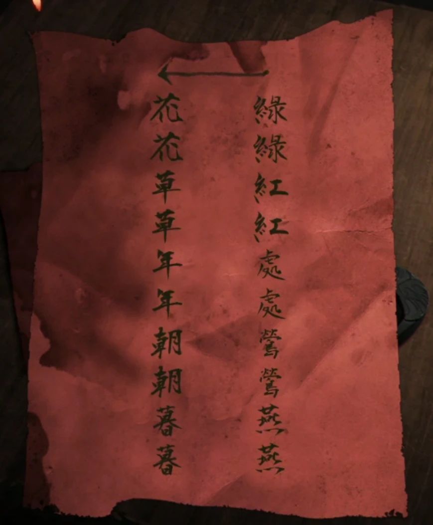 查看大厅使用钥匙就可以进入了,熟悉的纸人,不过不用点眼睛了,查看纸人拿到一根簪子,拿走簪子后纸人就会消失,查看一下柱子上的对联,左边需要并蒂莲,右边需要同心结。右边的功德箱需要鬼画符密码,后续注意,最前面的红色地毯上拿到一张符咒,看起来和我们前面用八卦镜烧掉的符咒一样。