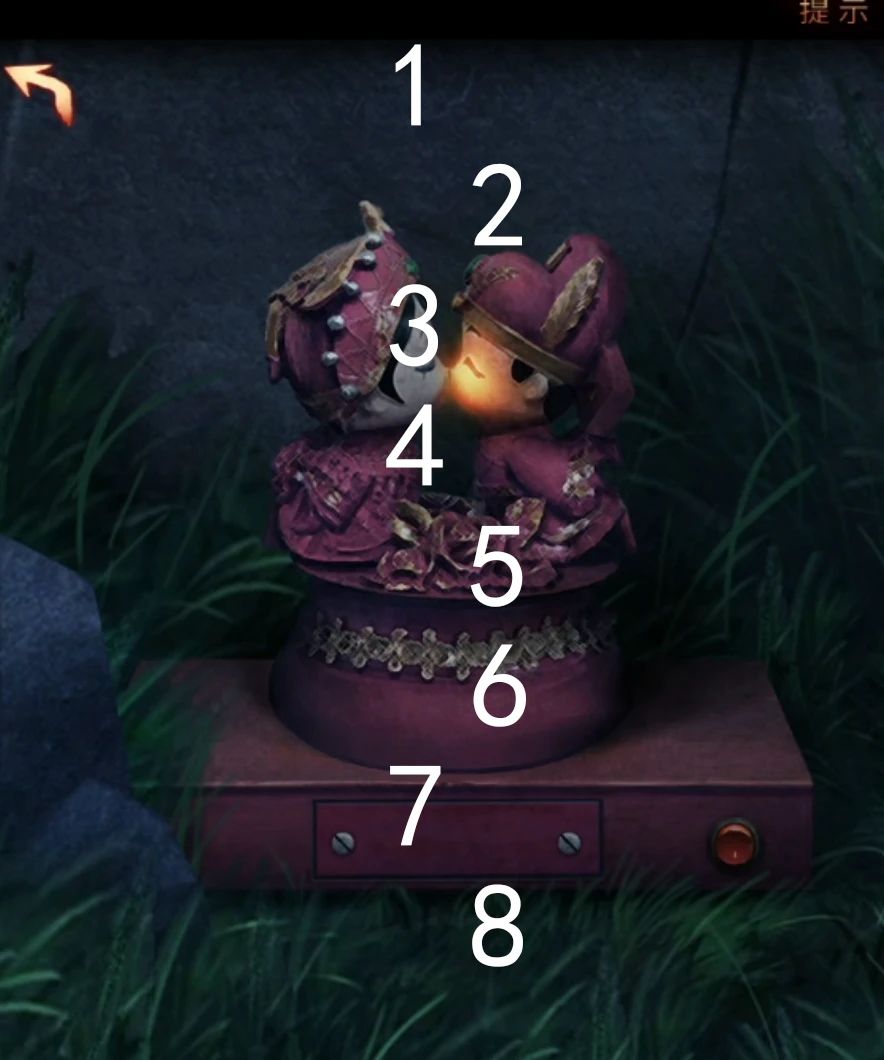 进门后先看一眼草坪上面的小机关,中间位置有螺丝,所以我们需要螺丝刀或者硬币,右边有个红色按键按一下发现两个小玩偶在左右轮流亮起,所以记一下亮起的顺序,后面肯定是能用的的。查看一下后面的两只狮子,左边的狮子当位置正确时候字会亮起,所以调整一下文字多尝试就能获得正确答案拿到白色珠子,如下图。
