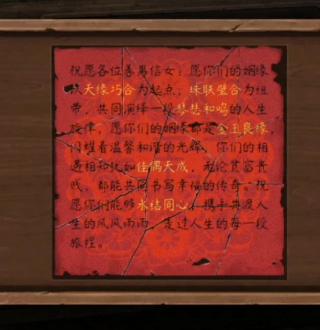 回到院子中查看右边的树,然后就莫名其妙的给树浇酒,完成后树上飘下一个红包,查看红包后使用剪刀就能拿到一张冥币,然后查看一下树上挂着的牌子,这些词看起来都很熟悉啊,前面拼图拼好的顺序天缘巧合-珠联璧合-琴瑟和鸣-金玉良缘-佳偶天成-永结同心依次点击之后拿到钥匙。