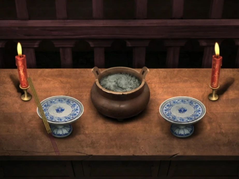 后退一下到小亭子场景,查看小亭子的窗口使用冥币获得线香,进入小亭子查看桌子上的蜡烛,使用蒲草后获得点燃的蜡烛草。再次进入小花园,对桌子上的茶壶底座使用木炭后使用点燃的蜡烛草,就获得了点燃的小香炉,然后对茶壶使用喜糖、蜂蜜、香囊,没错香囊竟然也是扔进去的!