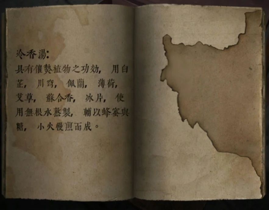 左边的柜子上拿到一套碗勺,柜子的机关需要一个能移动的物品,这种既需要文字又需要方向的就很麻烦了,查看一下右边椅子上的盒子,是个需要移动的机关,这个米雪不小心点到跳过了没有截图,打开盒子后拿到左边柜子的机关,查看书上是冷香汤的材料看一下。