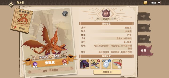 焦尾龙、熔岩龙、尖牙龙、火羽龙、没牙仔,焦尾龙的AOE可以作为前期推图的重要输出。开局50次10连自选抽焦尾龙抽到了记得保存,然后再看能不能抽到属性突出的(异色除了外观不一样,战力上目前没发现任何不同),不同龙的关键属性上会有星号提示。没牙仔签到第二天送,火羽龙作为火系治愈若是不想抽可以直接6元首充获得。