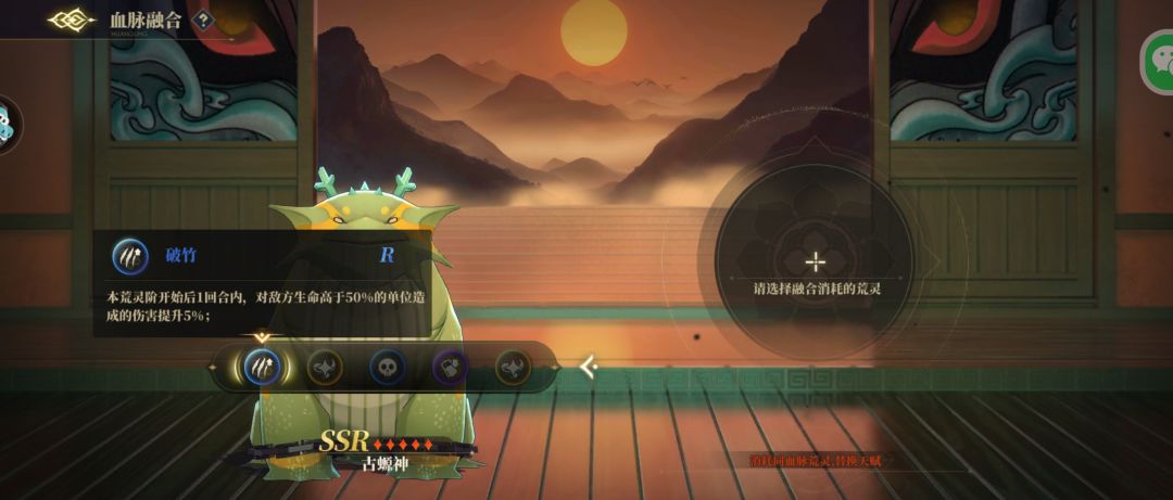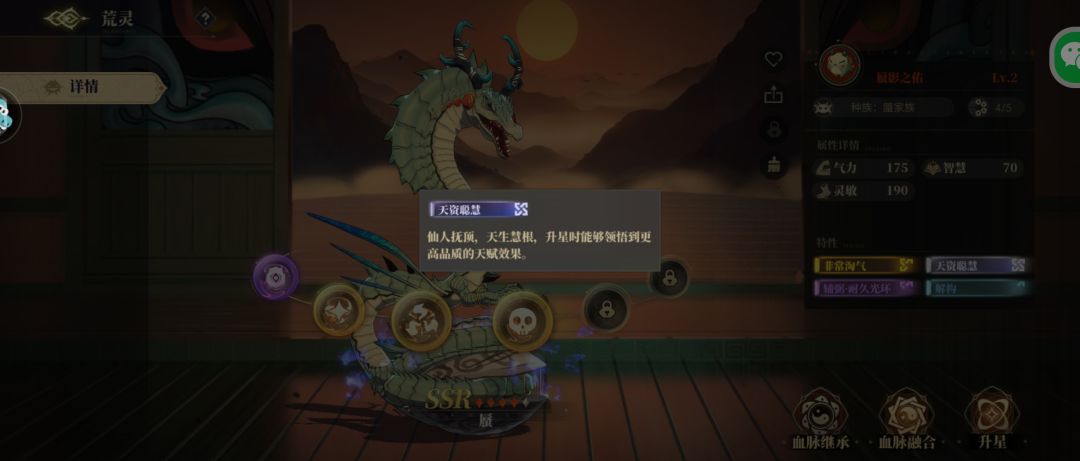 荒灵的血脉融合系统是更换荒灵天赋的地方,如图我的荒灵天赋是2个蓝色,1个紫色,(金色是自带的技能,可以无视,所有都有)如果我需要更换天赋的话,就需要用到特性是(天资聪慧)的荒灵,升到3星解锁第一个技能之后,看出来的是什么天赋,如果是橙色好天赋就可以替换到主力荒灵上面,如果没出就直接分解,培养下一个,千万不要因为他带的天资聪颖就升五星看下个技能是啥,资源消耗太大,还不一定能出好的(天资聪慧只是加了概率,并不一定会出好技能)