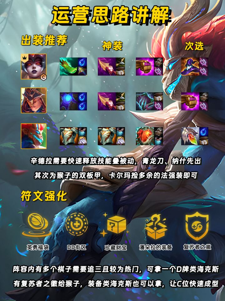 辛德拉和猴子装备比较关键,前期物理装过多的话可以去玩复苏金丝猴