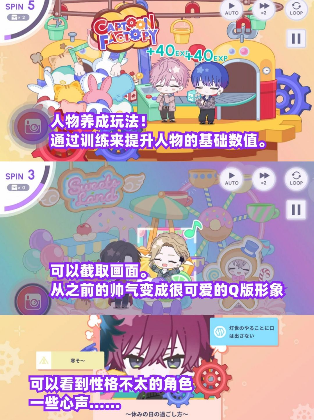 玩法上来说就是配合音乐节奏的消消乐游戏了!带感的节奏下完成combo还挺有趣的!UI界面也都做得非常炫酷!本作的声优阵容尤其豪华:古川慎、福山润、小野友树、小林裕介、小西克幸、谷山纪章等,人物设定上各种性格+设定的都有,你一定能找到一眼心动的男嘉宾。
