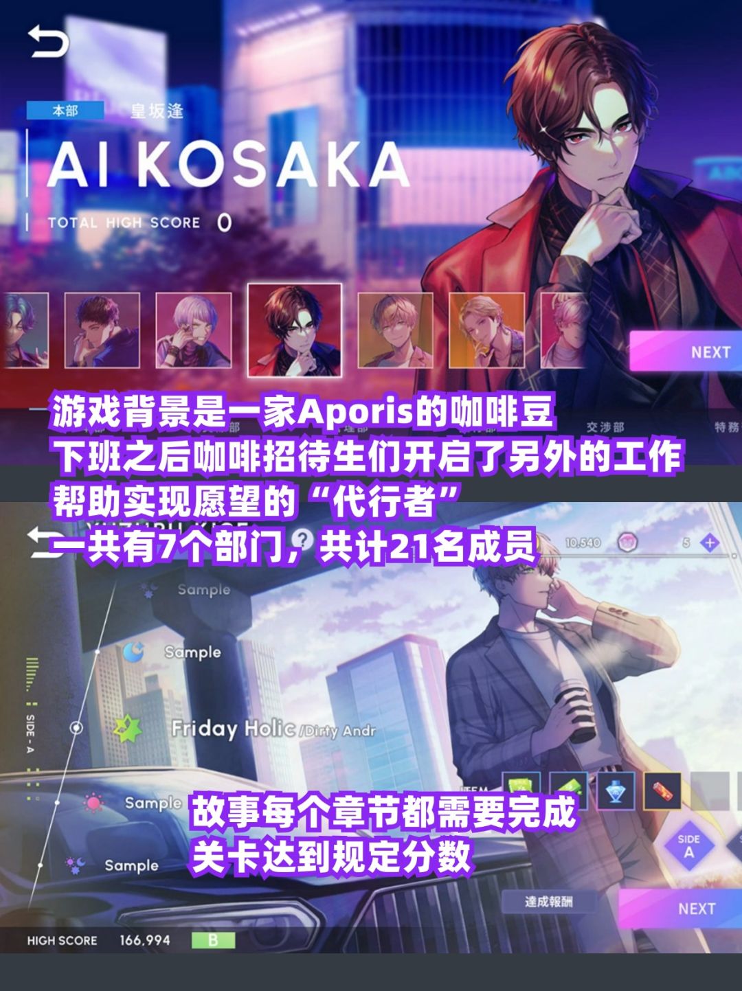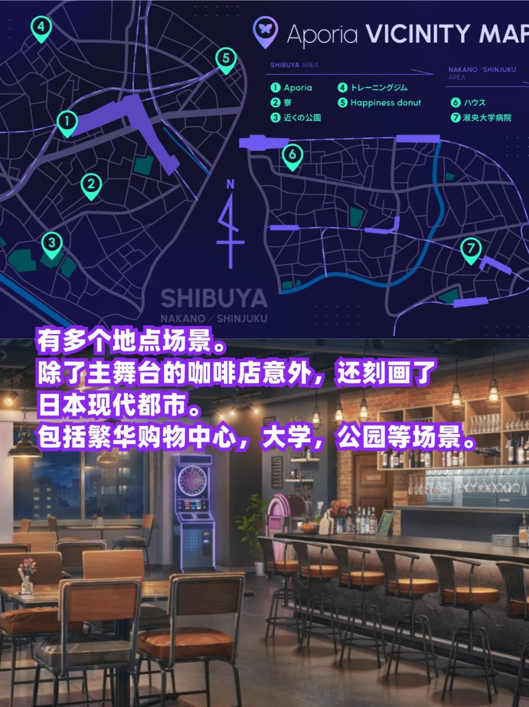 故事背景为现代都市,一个名为Aporia的咖啡店有一群才华横溢但有些 “不务正业 ”的员工。玩家将作为代理店长登场,在作为普通咖啡店结束一天的营业后,你将与一共7个部门的21位男角色一起开启为客人解决难题的万事屋!