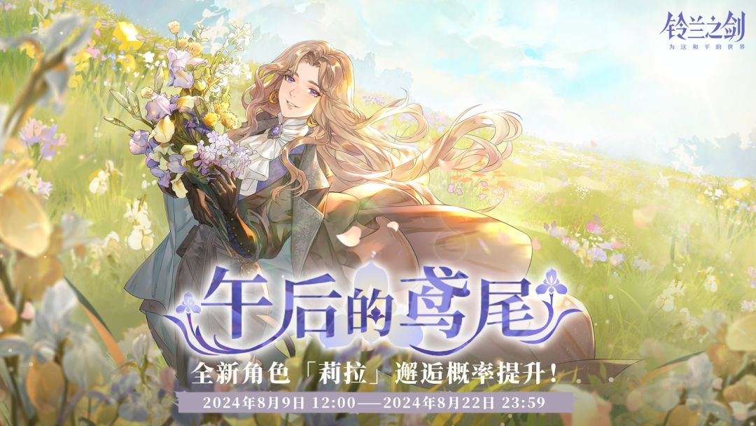 「午后的鸢尾」初遇限时邂逅将于 2024/8/9 12:00 - 2024/8/22 23:59 开启,全新传说角色「莉拉」邂逅获取概率将大幅提升!