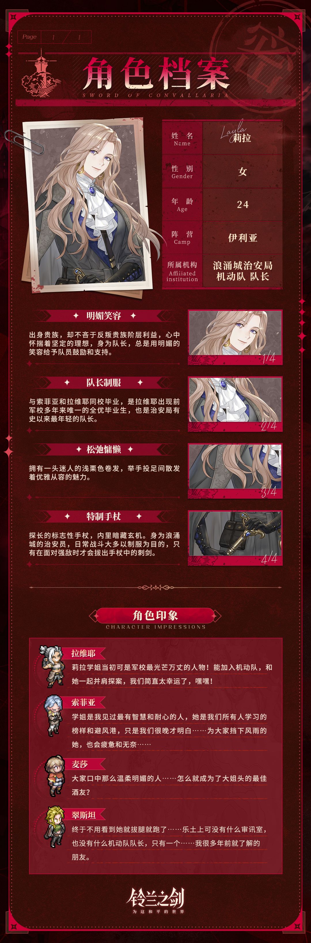 浪涌城治安局机动队队长,与索菲亚和拉维耶同校毕业的学姐,拥有夏日午后暖阳般明媚而温柔的个性,举手投足间散发着优雅从容的魅力。莉拉出身贵族,却不吝于反叛贵族阶层利益,始终与一切罪恶和不公抗争着,坚信最微小的光明也可以驱散最深重的黑暗。心怀这份理想主义坚持的她,不但是每个队员心中的避风港,更是为众人照亮前路的一束不灭的光。