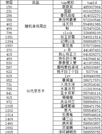 根据活动规则,本次幸运奖已通过tap抽奖抽出,请中奖用户及时填写收获信息,其余奖项通过随机抽取楼层数字的方式得出获奖名单。