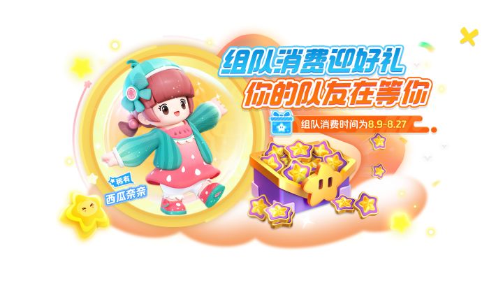 8月9日-8月27日上线元梦派对!邀请星搭子加入小队,合作完成消费任务,即可领取稀有外观【西瓜奈奈】!