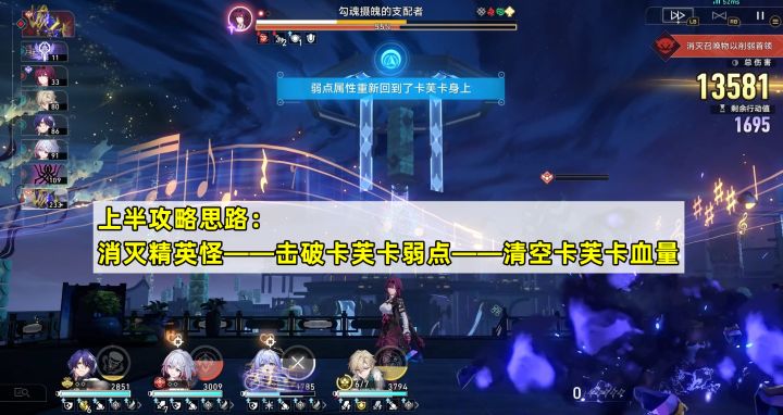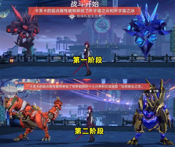 战斗中卡芙卡还会使用技能强化这些精英怪。考虑到弱点转移和伤害减免的机制,以及我们消灭精英怪后,还能将弱点转移回卡芙卡身上,并且削减她一段相当长的韧性,那么攻略思路就很明确了:消灭精英怪——击破卡芙卡弱点——清空卡芙卡血量,重复两轮即可。