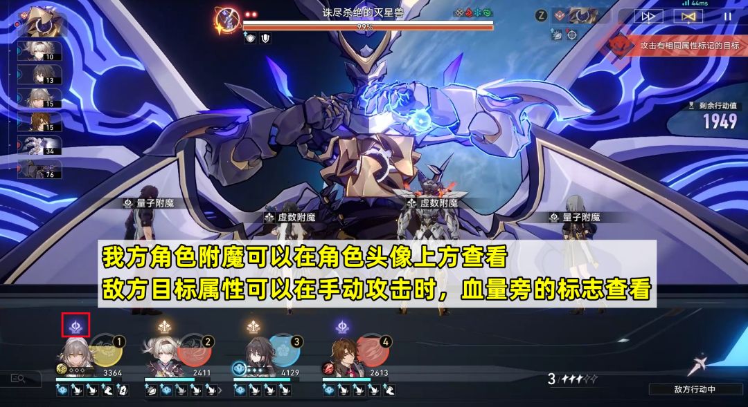 下半boss是灭星兽,相比我们平时周本里见到的它,主要是多了攻击会给我方单位附加量子/虚数属性附魔。这个附魔是双刃剑,如果不能及时消除,接下来会被灭星兽的攻击打进“缠禁”状态;但是如果攻击相同属性的目标(在手动攻击时,敌人血量条的右侧能看到属性标志),不仅能消除附魔状态,还能削减本来角色属性以外的韧性。