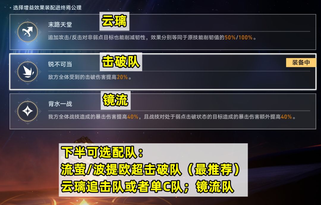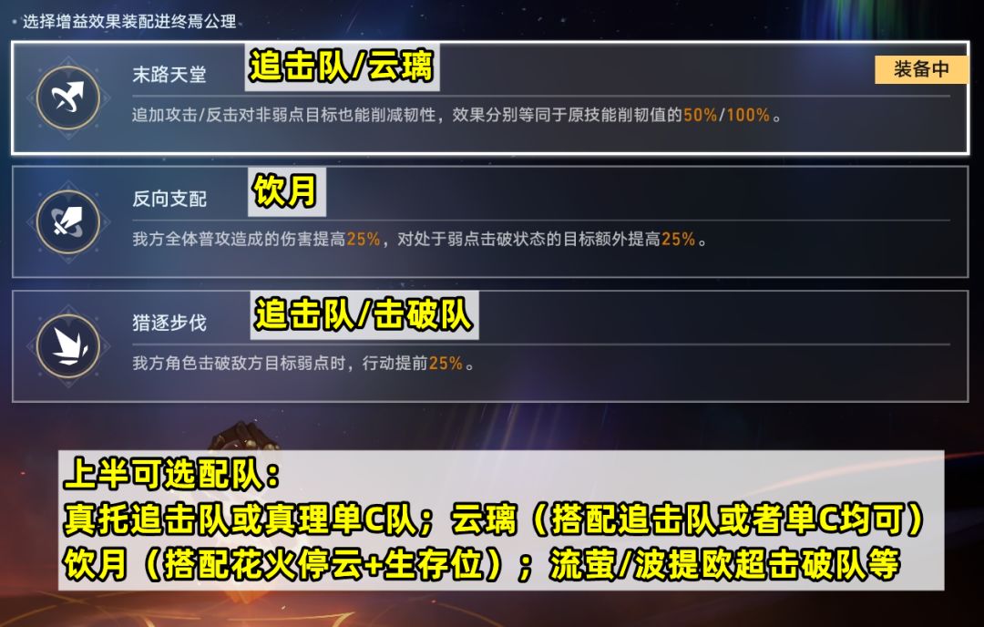 上半可选的配队有真托追击队、真理单C队、云璃(搭配追击队或者单C均可)、饮月(搭配花火停云+生存位)、流萤/波提欧超击破队等。队伍buff选择方面,第一个buff推荐搭配追击队以及云璃;第二个buff搭配饮月;第三个buff搭配追击队(本身就有对应弱点的C)或者击破队均可。