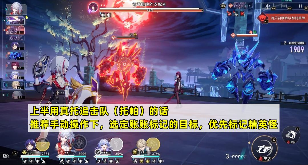 最后补充一点,上半如果选择的真托追击队,推荐手动操作选定一下账账的标记目标,优先消灭左右的精英怪,因为自动的情况下,队友基本都会优先攻击被标记的目标,万一精英怪还没消灭,但是标记了卡芙卡就有点尴尬了。下半如果选的流萤队则相对轻松,如同上面所说的,自动战斗同样能轻松解决~