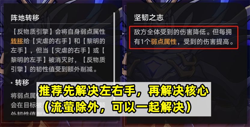 灭星兽的一般攻略思路就是:先消灭左右手,此时会将弱点全部转移回中间的反物质引擎;加上boss有个机制是每拥有一个弱点,受到的伤害会提高,此时中间的核心就更容易解决。三个召唤物全部消灭,boss瘫痪后,就意味这一阶段的血量能瞬间清空了。