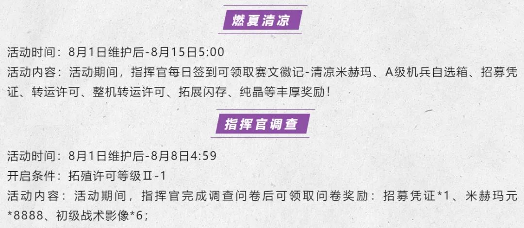 大家好,我是有点无聊的何二维一。这周又没啥新的活动了......一个老角色的和老机兵的UP池返场,一个签到活动和一个......问卷活动就是这周四到下周三的全部活动了,而且不出意外的话,下周四到下下周三的活动也只有一个转盘......所以这马上要步入8月的上半个月就是一阵子超长的长草期,本来以为进入了联动版本之后可以稍微解决一下这个长草的问题,但莫想到......居然联动期间长草的趋势依旧不止,还是希望官方能够重视一下这个问题吧,要不然玩家的粘性真是会受到影响的。