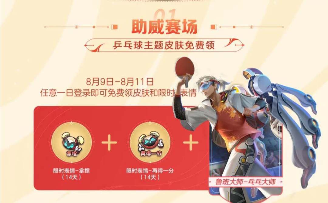 8月8号王者荣耀将会迎来一次更新,这次更新的主要目的自然是为了上线七夕节限定皮肤和新英雄少司缘,除此之外还有一些活动也会上线。另外不仅仅七夕节活动,官方还上线了奥运会助威活动,如下图所示,在9号到11号这几天内,玩家只要登录游戏,就可以领取一款皮肤和限时表情。
