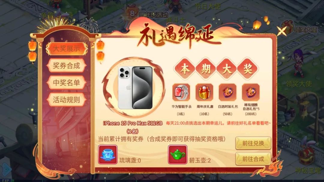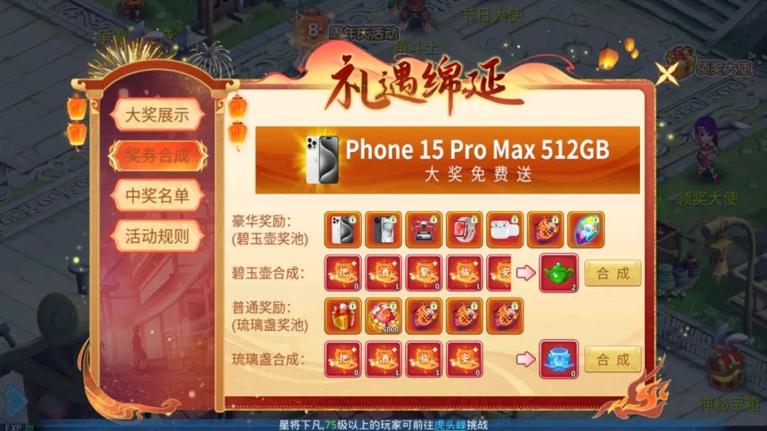 参加游戏内活动可以获得“把”“酒”“聚”“临”“安”五个活动道具,使用对应道具可以兑换“碧玉壶”“琉璃盏”道具;“碧玉壶”“琉璃盏”道具可参与活动抽奖,有机会获得iphone15 pro max、无人机等豪华大奖!