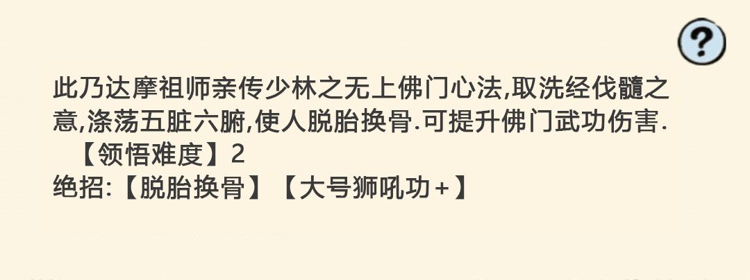 简介:此乃达摩祖师亲传少林之无上佛门心法,取洗经伐髓之意,涤荡五脏六腑,使人脱胎换骨。可提升佛门武功伤害。